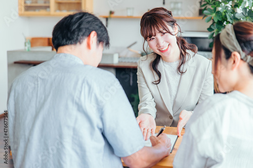 Obraz premium 夫婦と打ち合わせするビジネスウーマン(3人)