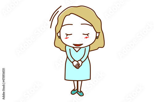 Obraz premium (全身正面)笑顔で礼儀正しく丁寧にペコリと頭を下げて挨拶をする白人女性
