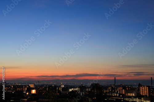 © Takamori Miyagishi , Fototapeta premium 早朝、日が昇りあたりはオレンジ色に染まる。大阪湾の先に和泉山脈・紀伊山地の稜線が見える。
