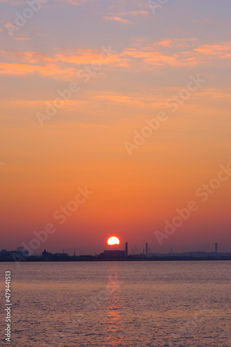 © Takamori Miyagishi , Fototapeta premium 早朝、朝日にキラキラ輝き、黄金色に輝く海。兵庫県芦屋市芦屋浜より大阪湾を臨む。遠くに大阪南港のビルが見える