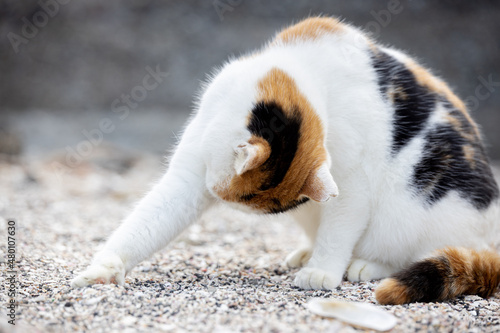 © MORNINGS, Fototapeta premium 浜辺でくつろぐ三毛猫