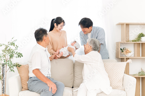© buritora, Fototapeta premium 赤ちゃんを抱いた若い夫婦と老夫婦(里帰り)