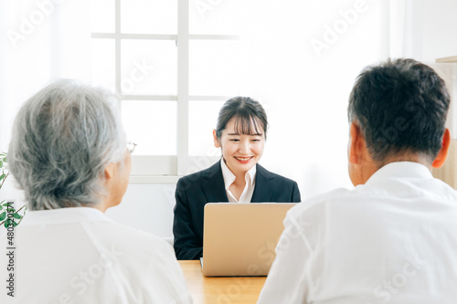 © buritora, Obraz premium パソコンで説明するスーツ姿の女性と高齢者夫婦