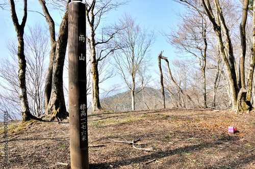 Fototapeta premium 春山の樹走路 丹沢山地の雨山山頂 "雨山の山頂は狭く、山頂を示す道標がある。周囲は樹林に囲まれていて、檜岳方面の展望が見れるだけ。...