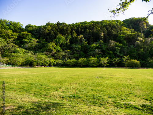 Obraz premium 芝生と小山。郊外風景。