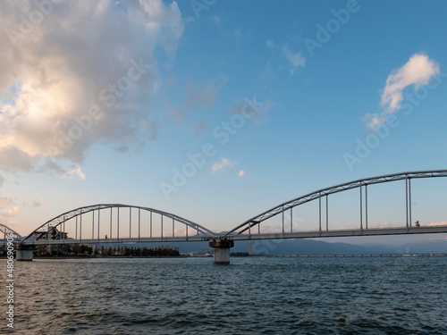 Naklejka premium 夕暮れ時の 晴れた琵琶湖瀬田川にかかる 瀬田川共同橋