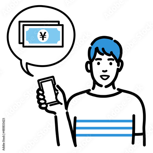 © トワトワ, Obraz premium スマートフォンを持ってお金の説明をしている若い男性