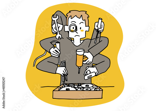 Naklejka premium さまざまな道具を使いこなし機械をなおす男性 探究心とアイディアの模索 温かみのある人物イラスト