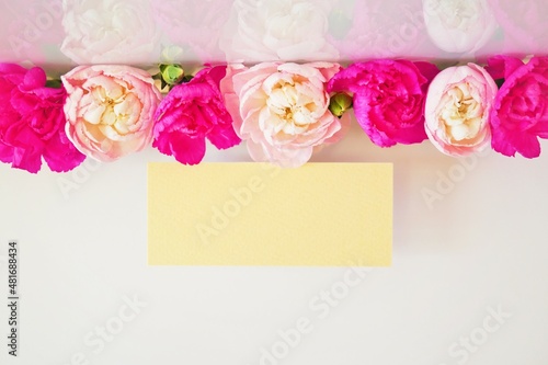 Obraz premium 一列に並んだ赤とピンク色のカーネーションの花を添えた何も書かれていないのカードのモックアップ