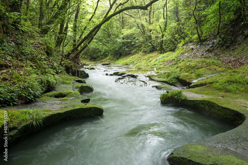Obraz premium 緑の森の下の侵食された岩と川の流れ