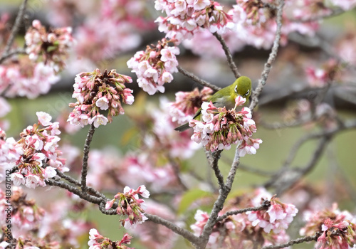 © kamatari, Fototapeta premium 四国香川県丸亀市の寒桜(かんざくら)とメジロ