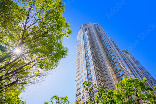 Obraz premium ビル 未来イメージ 都会風景 ビル群 新宿 新宿副都心 新緑 ガラス 写り込み 反射