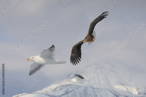 Obraz premium 知床半島の流氷とオジロワシ(北海道羅臼沖)