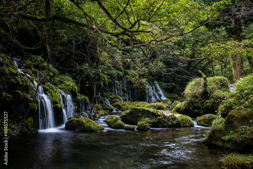 © DKF, Obraz premium 苔が生えた緑の岩と滝の流れ