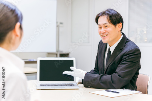 Obraz premium 打ち合わせをする白手袋をつけたビジネスマン(笑顔)