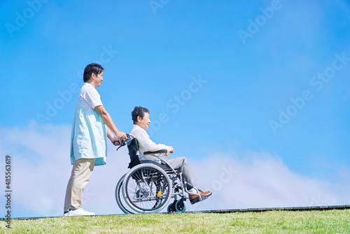 Obraz premium 介護士と車椅子に乗る高齢者 屋外