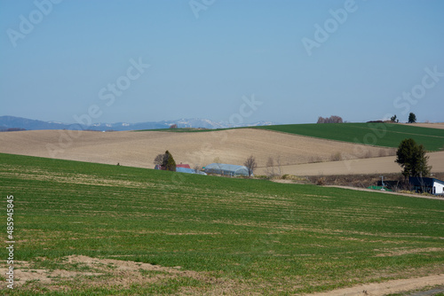 © kinpouge, Obraz premium 春の丘陵地帯の緑の麦畑