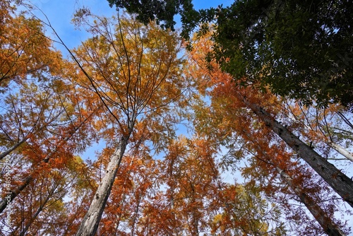 © Scott Mirror, Obraz premium 青空バックに見上げる針葉樹の黄葉@神戸、兵庫