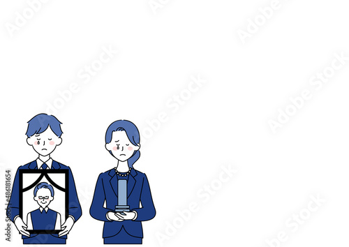 Naklejka premium 遺影や位牌を持つ喪主と家族