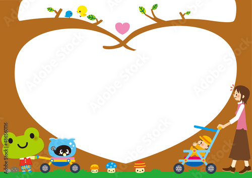 Obraz premium フレーム,家族,動物,ママ,赤ちゃん,カエル,ベビーカー,おたまじゃくし,育児,子育て,保育,キノコ,ひよこ,ヒヨコ,鳥,お母さん,手押し車,ファミリー,親子,子供,子連れ,お出かけ,乳母車,ウサギ,木,葉,散歩,外出,シンプル,かわいい,ハート,ネズミ,きのこ,おすすめ,提案,応援,お知らせ,案内,説明,枠,メッセージ