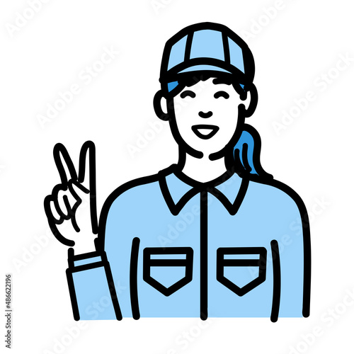 © トワトワ, Obraz premium ピースサインをして笑顔の作業服を着た若い女性