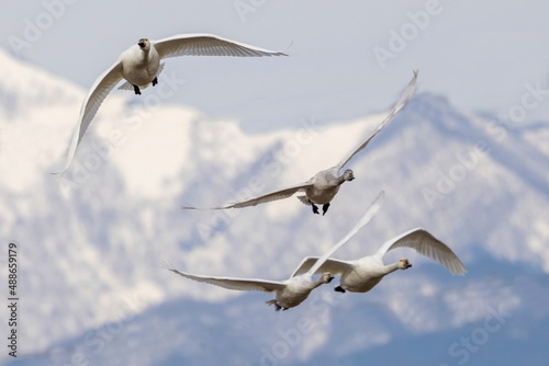 © cat_smile, Obraz premium 山並みを背景に飛翔する白鳥