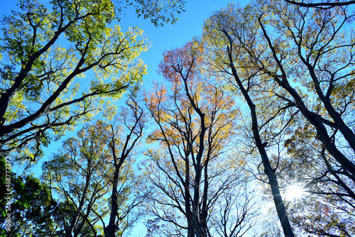 © 中村 栄史, Fototapeta premium 東京都 水元公園 色とりどりの木と青空