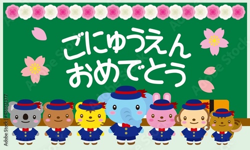 Fototapeta premium 動物たちのごにゅうえんおめでとうと紅白のお花