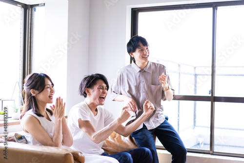 Fototapeta premium 家でスポーツの試合を観戦する若い男女