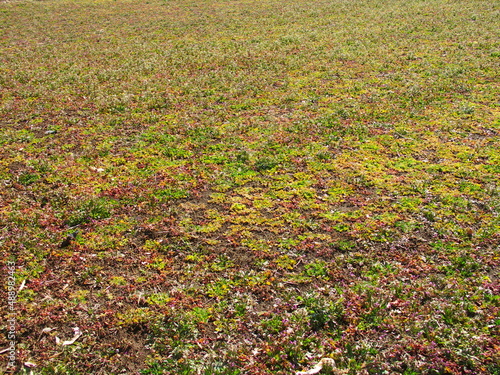 Obraz premium ホトケノザ咲く早春の休耕地風景