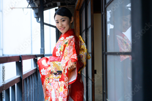 Fototapeta premium 古民家のベランダにいる20代の着物の女性