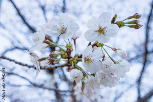 © bluebellivy, Obraz premium 満開の川沿いのソメイヨシノの花 背景 風景