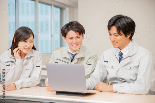 Obraz premium 作業着をきてミーティング