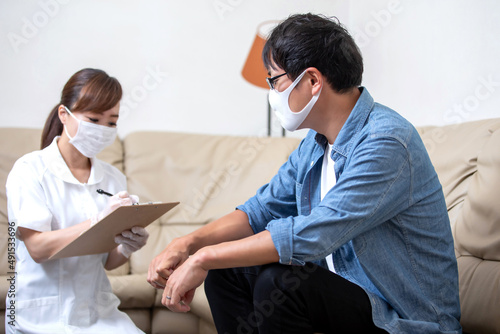 © buritora, Obraz premium 問診票に記入する看護師と患者(マスクと手袋)