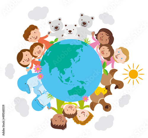 Fototapeta premium 地球環境を考えてあらゆる人種も動物も植物も手を繋ぎ仲良し家族