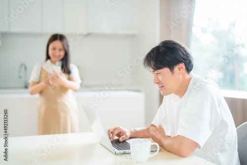 Obraz premium テレワークする男性とスマホを使う妊婦(笑顔)