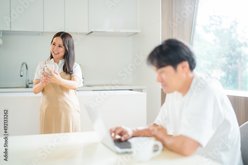 Obraz premium テレワークする男性とスマホを使う妊婦(笑顔)