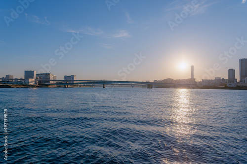 Naklejka premium 東京都江東区豊洲の夕方の都市景観