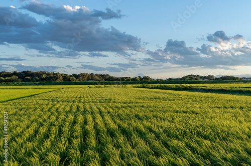 Naklejka premium 夕暮れの田んぼの風に揺れる稲