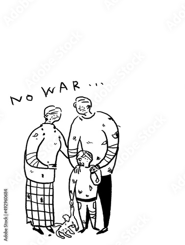 © POMO@Ymo, Obraz premium 怪我をした小さい子供とシニア男性と女性、孫と祖父母、線画(縦、左下配置)