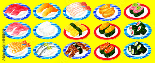 © 一色いっさ, Naklejka premium 皿に乗った色々な種類のお寿司のセットイラスト 日本料理の手描き水彩イラスト素材集
