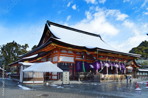 Naklejka premium 雪化粧した京都市八坂神社の国宝本殿