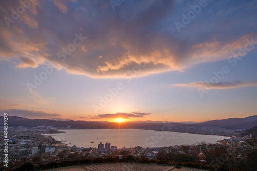 © Kazu8, Fototapeta premium 長野県諏訪市立石公園からの諏訪湖と夕日