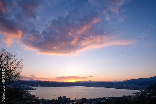 Obraz premium 長野県諏訪市立石公園からの諏訪湖と夕日