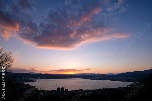 © Kazu8, Obraz premium 長野県諏訪市立石公園からの諏訪湖と夕日
