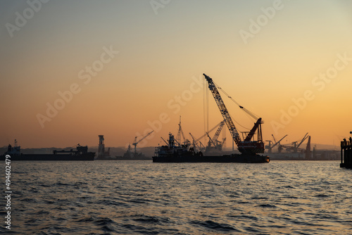 Obraz premium クルーザーから見た工業地帯の夕焼け
