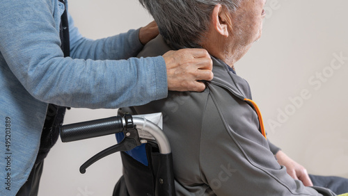 Fototapeta premium 車イスに乗った高齢者旦那の肩に手を置き介護する老人妻