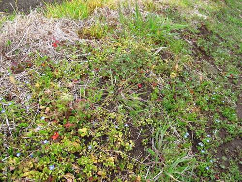 Obraz premium 雨上りの畑の畦道の若草