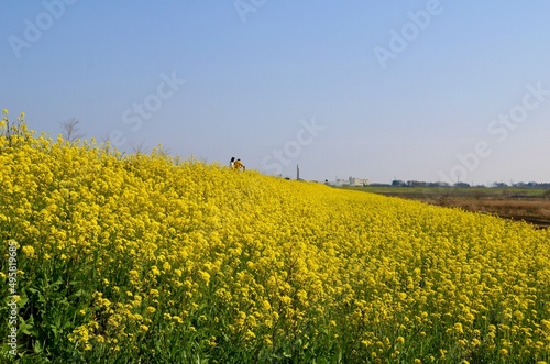 Obraz premium 春の渡良瀬 満開に咲く菜の花 風景