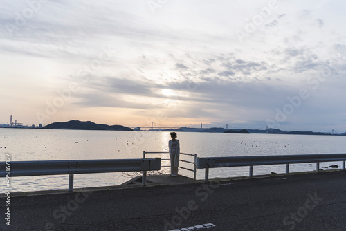 © peach100, Naklejka premium 夕暮れの海岸線を歩く女性